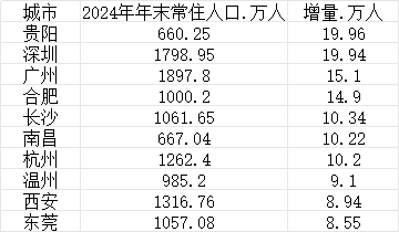 第一财经记者对各大城市2024年常住人口数据统计梳理后发现,共有12个城市去年常住人口增量超过8万人,其中前十城市分别是贵阳、深圳、广州、合肥、长沙、南昌、杭州、温州、西安和东莞,前7个城市去年人口增量超过10万人。